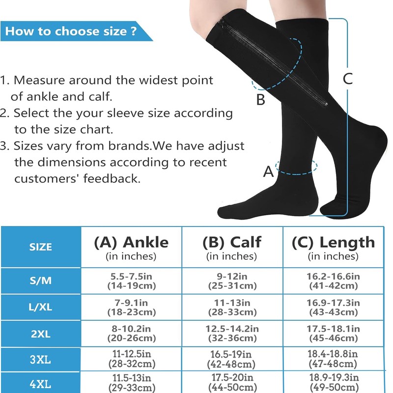 - Materiales de alta calidad que no pierden la compresión: 75% nailon, 25% elastano, son cómodos y duraderos, altamente transpirables, calcetines de compresión circular de algodón suave que protege la piel, los calcetines de compresión con cierre tienen tres tamaños para la mayoría de las personas, utilizados con cierre, los músculos de la pantorrilla no se deslizan fácilmente, estos calcetines de compresión de soporte alto para hombres y mujeres de 15 a 20 mmhg aprietan la piel de las piernas y t