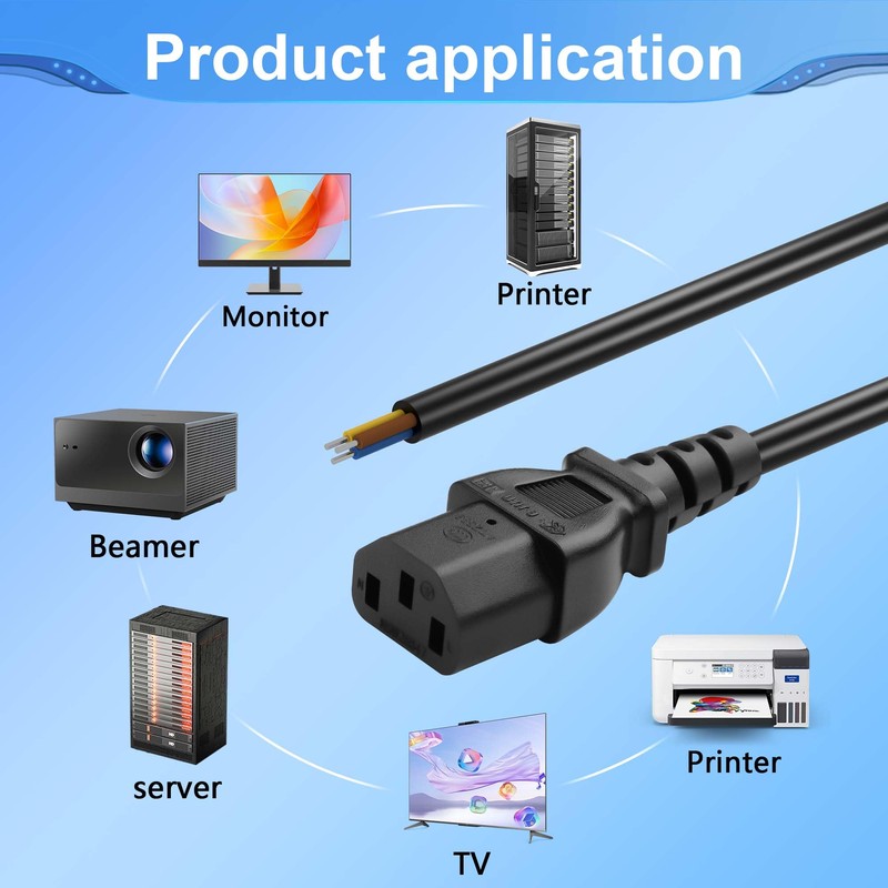 - C13 Pigtail Power Cable,One end of this power cord is bare, and the other end is a C13 female 3-pin power plug, which allows you to assemble and terminate according to your needs, suitable for repairs and DIY projects