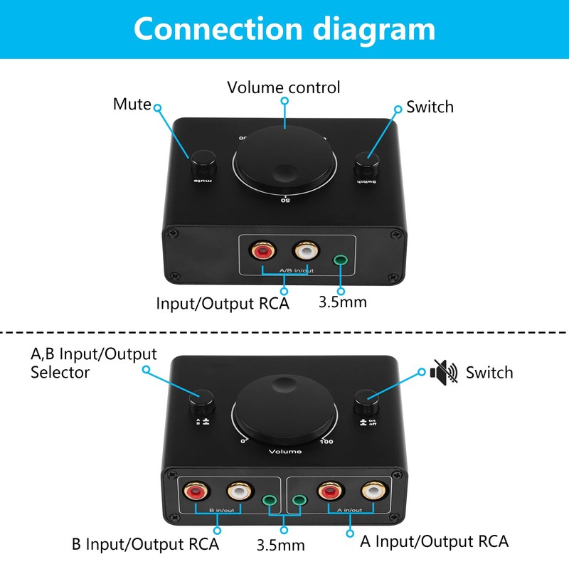 - 3.5mm RCA Stereo Audio Switcher supports two-way switching,allows to easily choose between two audio inputs and get one output or select between two audio outputs to receive one input.