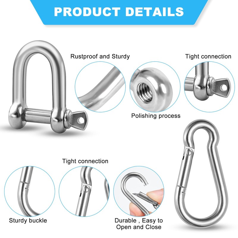 - Easy to use: D shackle stainless steel easy to use, can be used by simply straightening the shackle and the hanging object. Make sure that the item is completely through the stainless steel shackle. Close the shackle d shape and make sure the opening is fully closed for easy assembly and disassembly.