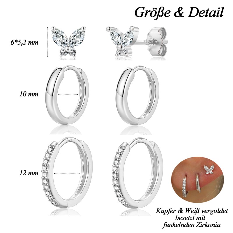 - Size: earrings stud set, butterfly stud earrings 6 mm. Hoop earrings 10 mm. Cubic Zirconia Earrings 12 mm.