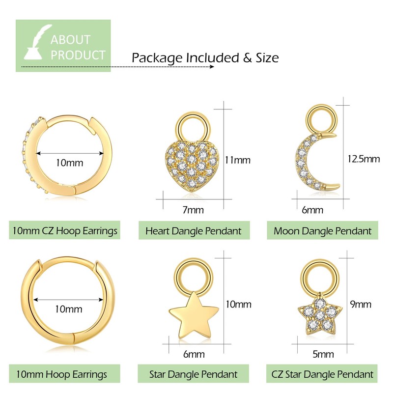 - 💖Ear Jewellery Set Package Included: 2 pairs of 10mm silver hoop earrings, 4 pairs of earrings dangle pendant (Including shape of Moon, Star, Heart) | Can be wear as cute dainty dangle drop earrings or wear alone for a minimalist hoop earrings look. Cute and lovely dangle earrings, a must-have earrings set for your jewellery wardrobe!