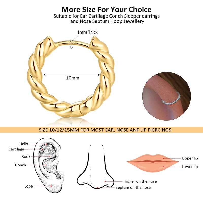 - 【Gold Hoop Earrings】Twisted hoop earrings design, Inner diameter: 10mm. This dainty cartilage earring hoop are suitable for Cartilage Helix Tragus Piercing Hoop | Perfect for stacking together or wearing alone for a minimalist look.