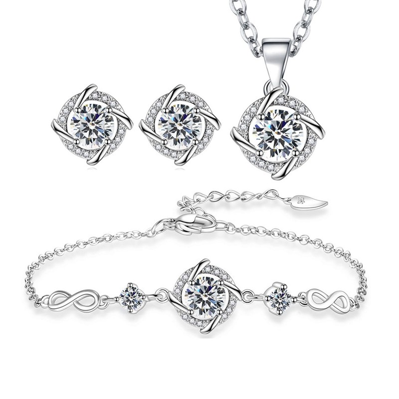CERSLIMO Silver Jewellery Set for Women Girls Ladies - 14k White Gold Round Cubic Zirconia Necklace & Stud Earrings & Charm Bracelet with White Crystal | Jewellery Set Wedding Gifts Birthday Christmas