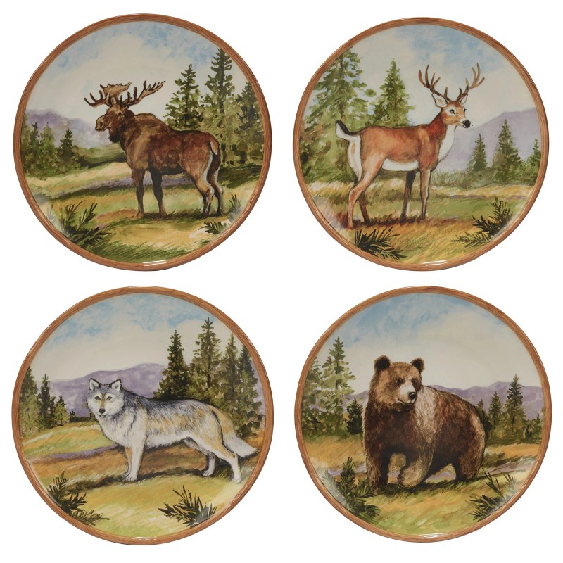 Product Description: Beautiful scenes of wildlife in the mountains decorate Certified International's "Big Mountain" ceramic collection. Designed by the popular artist Susan Winget, this rustic collection includes mix and match dinnerware and serveware with embossed, hand painted woodgrain rims. Featuring bear, wolves, and deer in their natural habitat, it includes a friendly 3-D moose and bald eagle cookie jar, a decorative yet functional way to store your favorite treats.