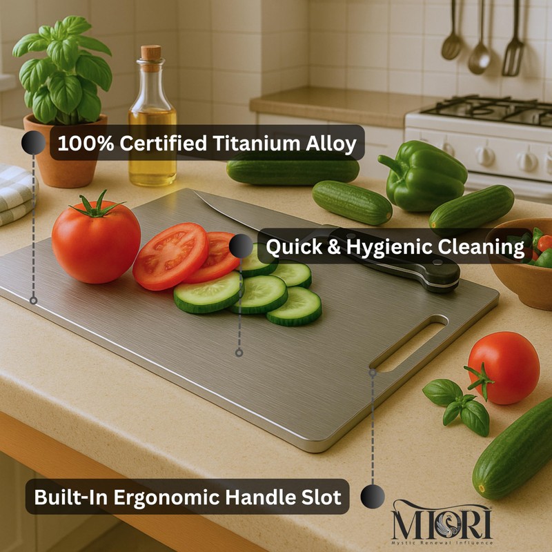- SLEEK & MODERN DESIGN: With its elegant metallic finish, this best titanium cutting board isn’t just functional it also enhances the look of your kitchen. Miori %100 pure titanium cutting boards for kitchen.