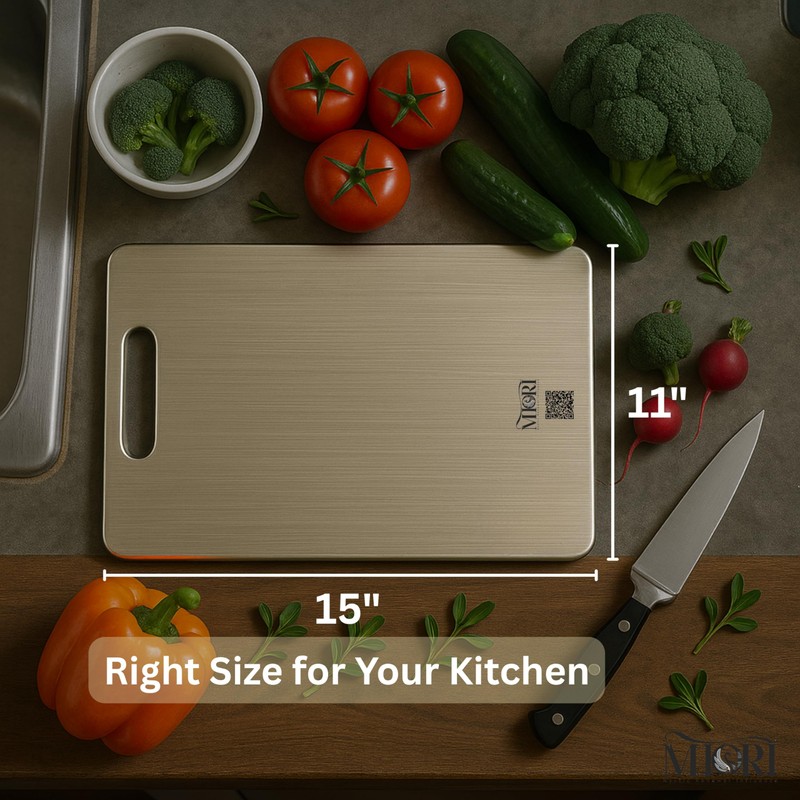 - SLEEK & MODERN DESIGN: With its elegant metallic finish, this best titanium cutting board isn’t just functional it also enhances the look of your kitchen. Miori %100 pure titanium cutting boards for kitchen.