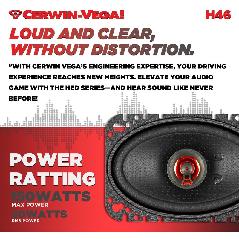 Elevate your car audio with the Cerwin Vega HED 2025 Edition H46, a 4” x 6” 2-way coaxial full-range speaker system designed to bring exceptional sound quality to your vehicle. As part of the HED Series, the H46 combines crystal-clear highs, full-bodied mids, and dynamic bass in a compact form, delivering a well-rounded, immersive listening experience. Whether you're enjoying your favorite tracks or simply cruising with your playlist, the H46 ensures your music sounds as vibrant as it should, every time you drive.