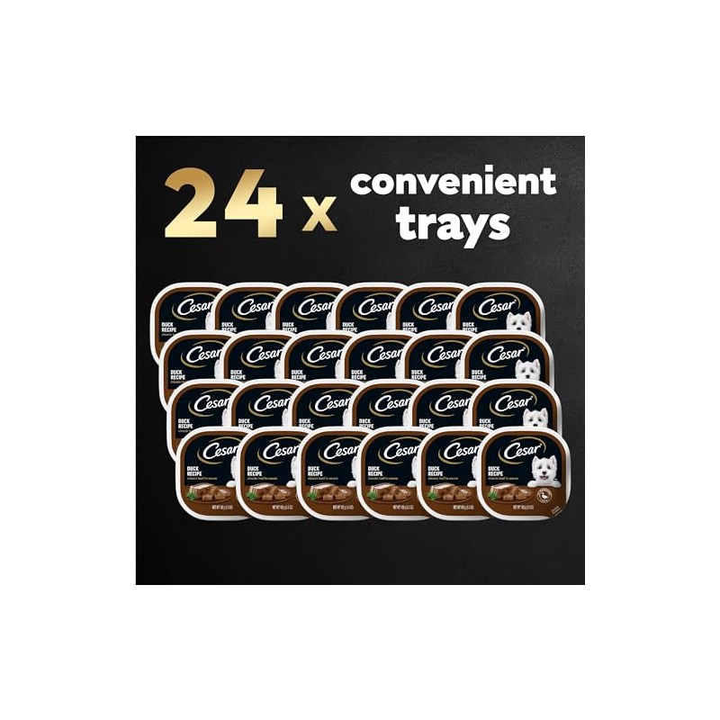 - Contains twenty-four (24) 3.5 oz. easy peel trays of CESAR Wet Dog Food Loaf in Sauce Duck Recipe