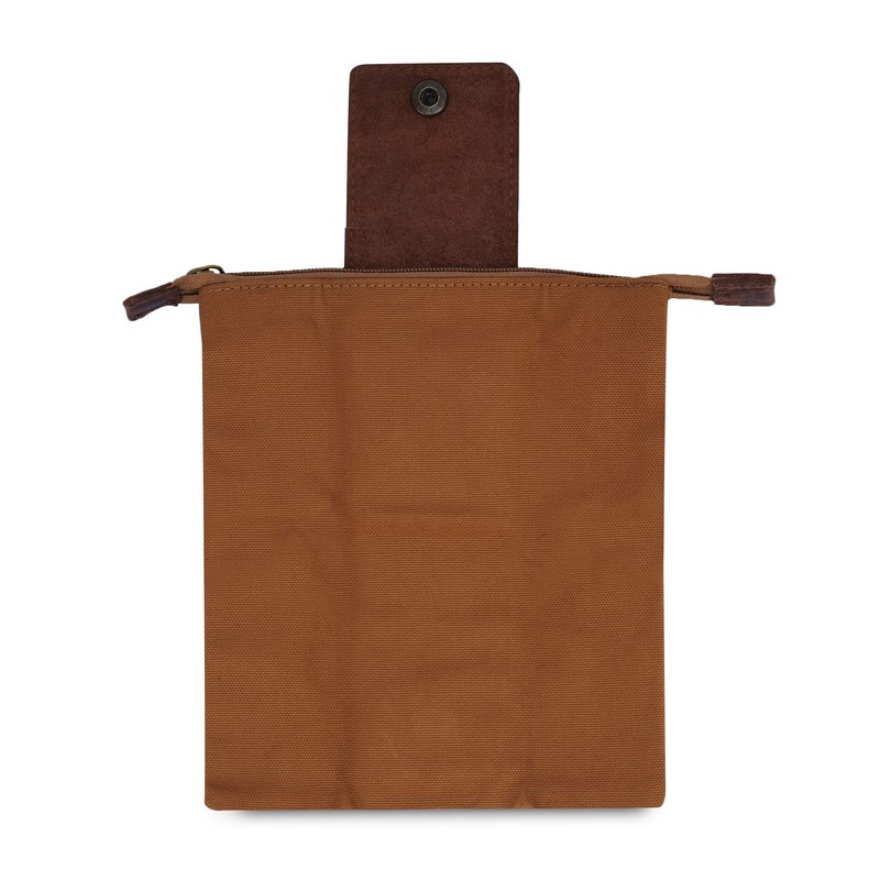 - Usage of Leather Canvas Pouch there is a loop on the fatigue waxed canvas pouch, so you can attach the foraging bag over your belt or backpack with two metal clasps. You can use it for hiking beachcombing, treasures flowers mushrooms seashells.