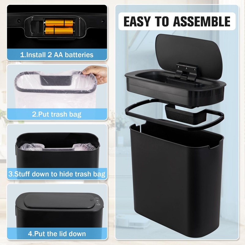 - Touchless Trash Can: Utilizing advanced infrared technology, its lid opens when your hand or any object is detected in the sensing area, eliminating the need for direct contact. Particularly beneficial for individuals with mobility challenges, the automatic functionality surpasses foot pedal options. Requires 2 AA batteries (not included)