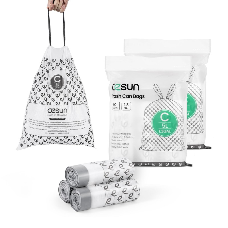 Cesun Code C Drawstring Trash Bags 90 Count, Pre Cut 1.3 Gallon / 5 Liter Small Trash Can Liners, White | Cesun