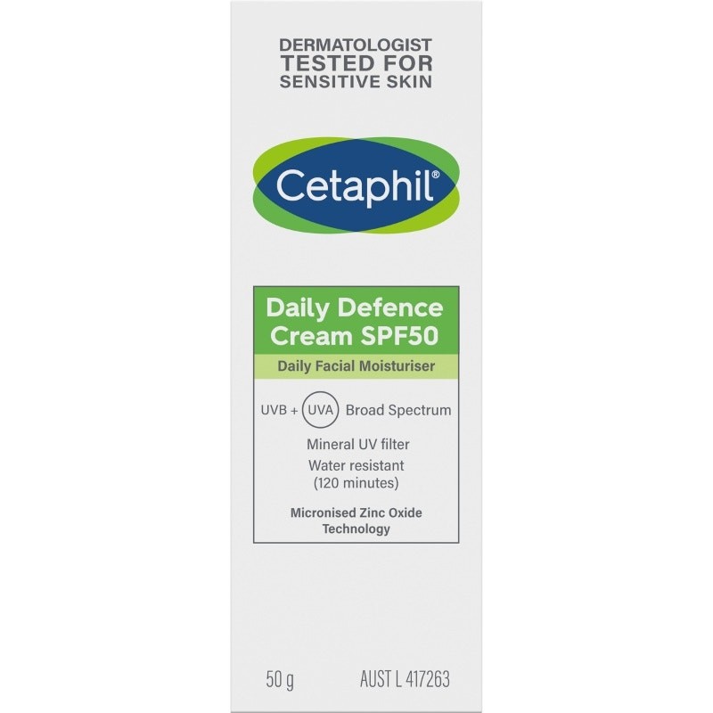 Cetaphil Daily Defence Cream SPF 50 is a daily use SPF 50 cream with a mineral UV filter. Formulated with micronised zinc oxide technology, this mineral sunscreen provides broad spectrum UVB + UVA protection with 120 minutes of water resistance to help prevent premature skin aging due to sun exposure. The formula contains no added fragrance and is dermatologist tested for sensitive skin.rays/sunburn & helps prevent skin aging due to sun exposure.