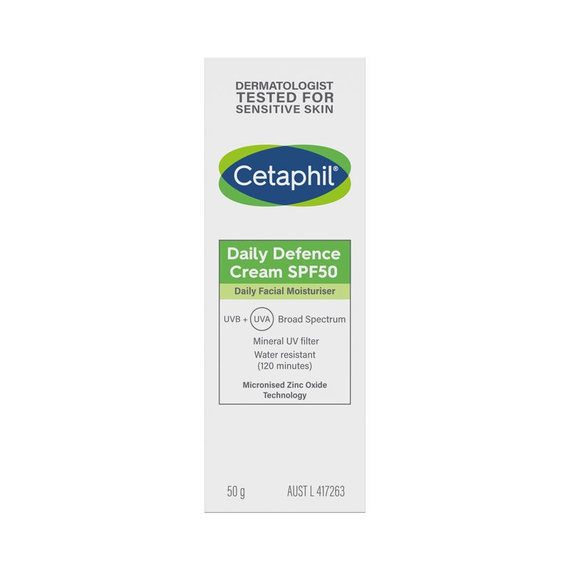 Cetaphil® Daily Defence Cream SPF 50 is a daily use SPF 50 cream with a mineral UV filter. Formulated with micronised zinc oxide technology, this mineral sunscreen provides broad spectrum UVB + UVA protection with 120 minutes of water resistance to help prevent premature skin aging due to sun exposure. The formula contains no added fragrance and is dermatologist tested for sensitive skin.rays/sunburn & helps prevent skin aging due to sun exposure.