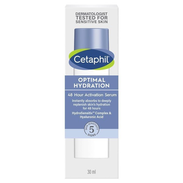Intensely hydrating, Cetaphil Optimal Hydration 48 Hour Activation Serum is specially developed to improve the overall quality and resilience of sensitive skin. This lightweight serum contains the innovative HydroSensitiv™ Complex that soothes your skin and deepens dynamic hydration, as well as Hyaluronic Acid, Sunflower Seed Oil, Shea Oil, Pro-Vitamin B5 and Vitamin E to rehydrate and restore the appearance of your skin. Ideal for morning and evening use on your face and neck, alone or layered.Size: 30ml