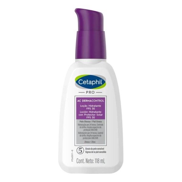 Cetaphil PRO AC Dermacontrol FPS 30 es una loción matificante y anti-acné para piel grasa, con FPS 30 para protección solar. Contiene tecnología oleosoma, Zinc y sílice para controlar el brillo, hidratar ligeramente y reducir enrojecimiento. Es no comedogénica e hipoalergénica, ideal para uso diario.