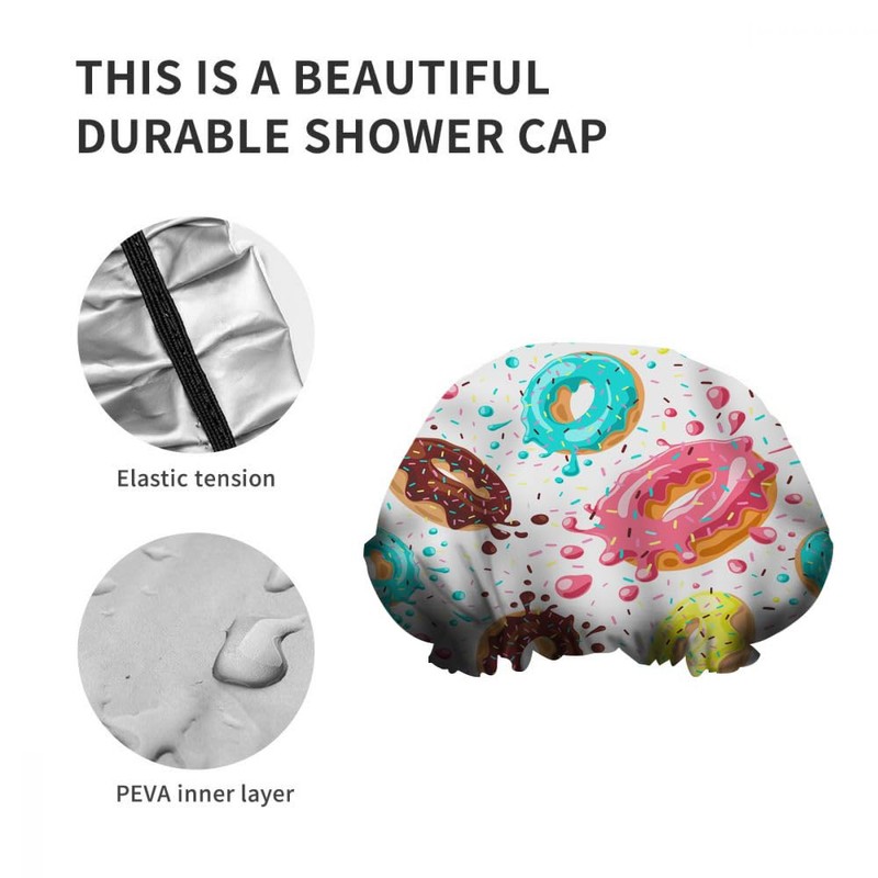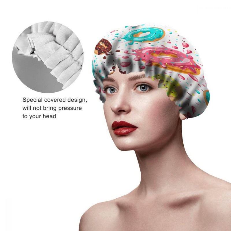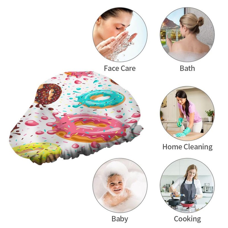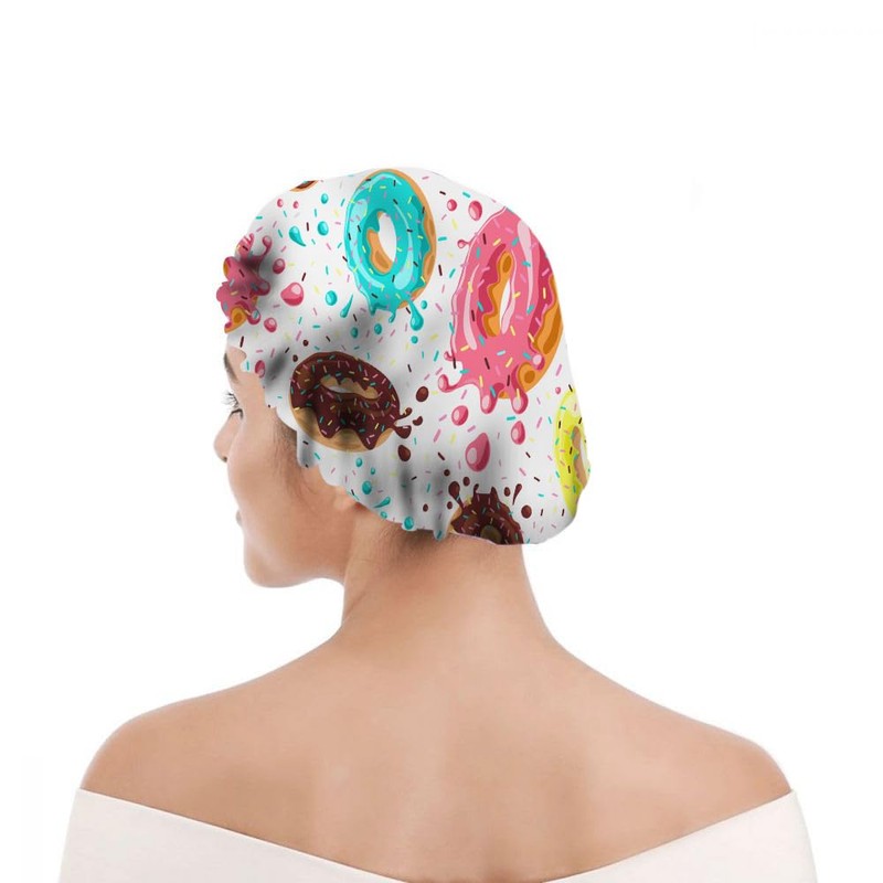 Ceutoiy Delicious Food Shower Cap for Women Elastic Reusable Donuts With Pink Chocolate Lemon Blue Mint Glaze Double Waterproof Layers Bathing Hat