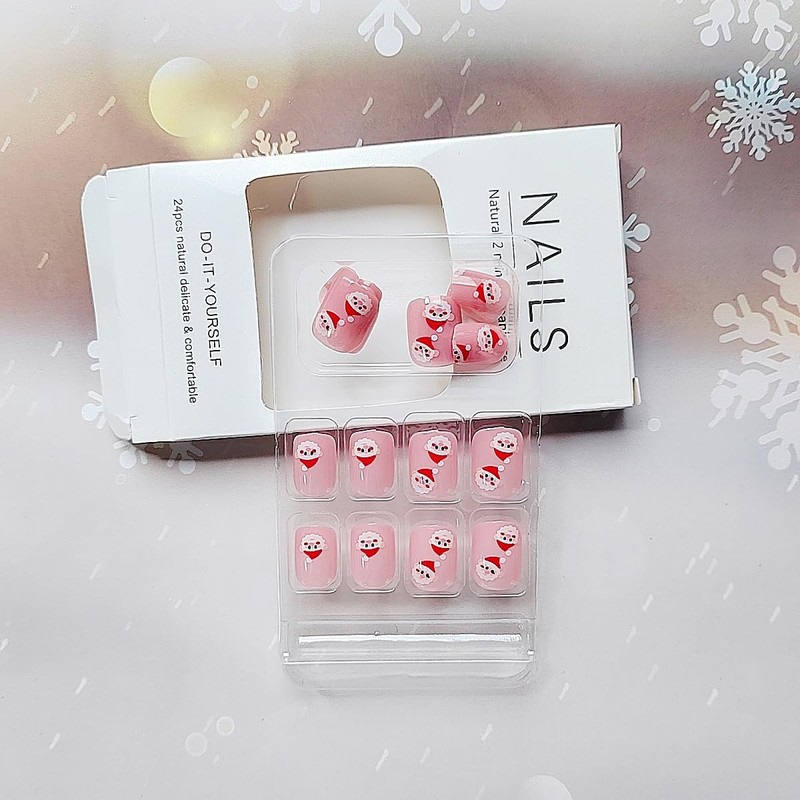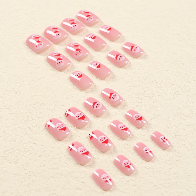 CEWEWP Christmas Press on Nails Short Square Fake Nails Pink Santa Claus Designs Xmas False Nails Cute Christmas Glue on Nails Short Acrylic Nails for Women 24 Pcs