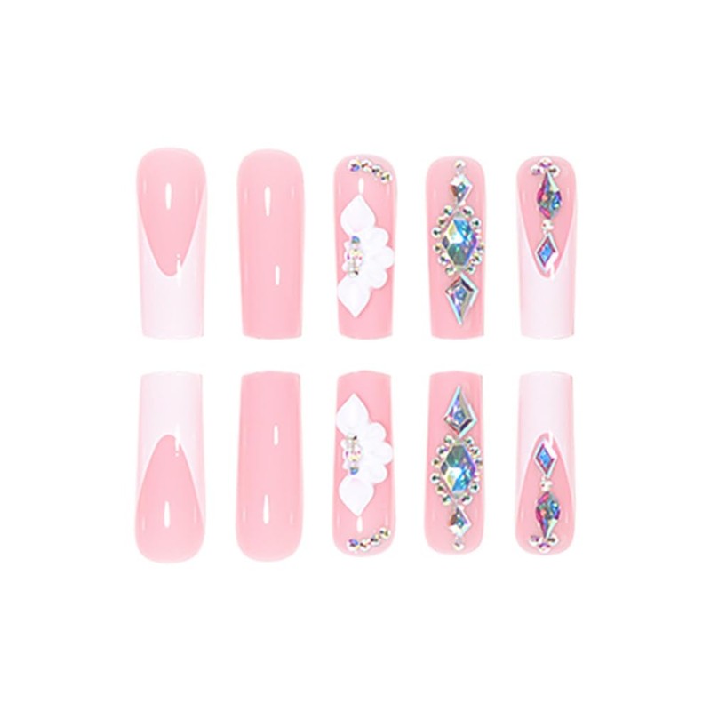 CEWEWP Long Press on Nails Square French Tip Fake Nails Full Cover False Nails with Rhinestones Designs White Nails Tip Acrylic Nails Exquisite Stamen Artificial Nails for Women DIY Manicure Art 24Pcs