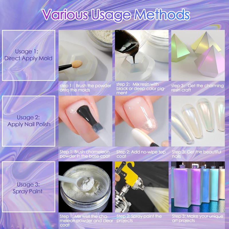 - 🫧Mica pigment's 3 Different Effects: Different color bases create a different effect surface. Applying pearl powder on a white background will produce aurora effect, and on a black background will be chrome effect. Mixing a small amount of pearl chrome nail powder into the black resin will produce like starry sky effect. So easy to use to get the variety of colors you’re looking for!