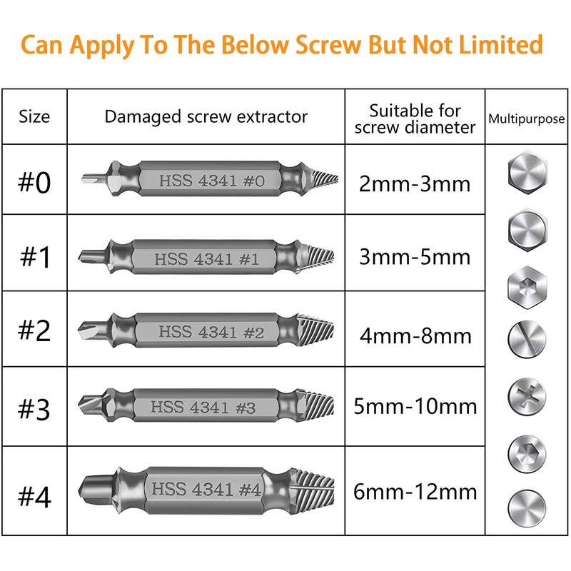 - Easy to use: only two steps to remove damaged screws, can work with various drill presses and screws or bolts of any size