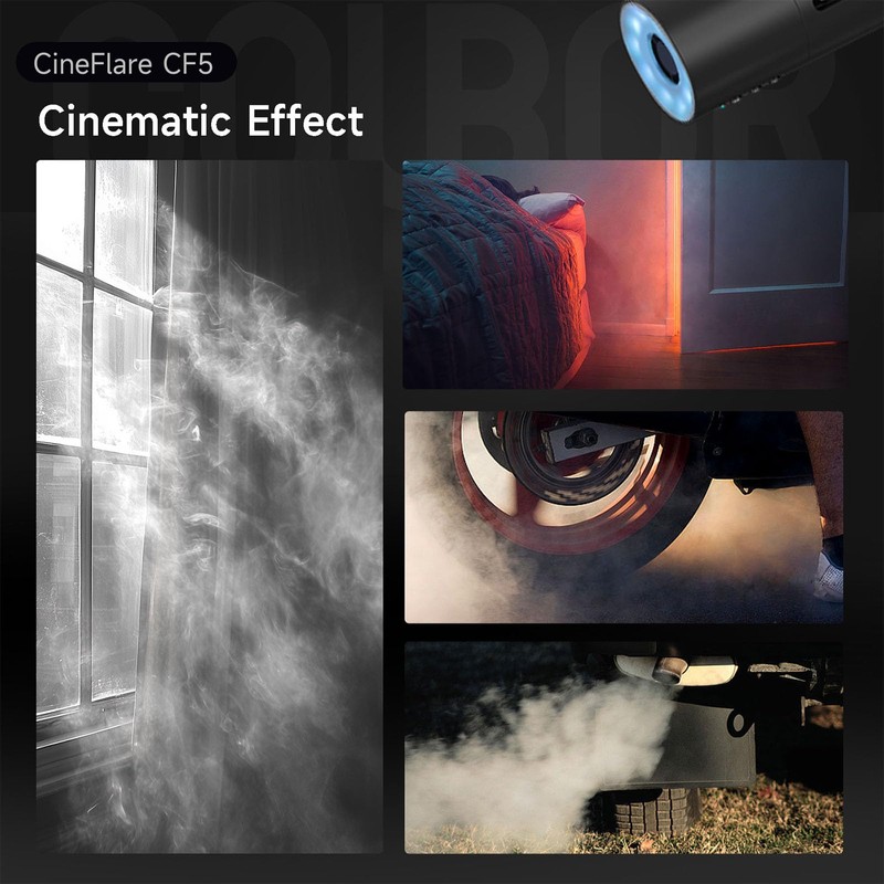 - 4.The CineFlare CF5 features a built-in magnetic RGB light with 360-degree color ring adjustment to add vibrant hues to your smoke effects. In addition, the CF5 includes a remote control that supports wireless operation up to 10 meters.