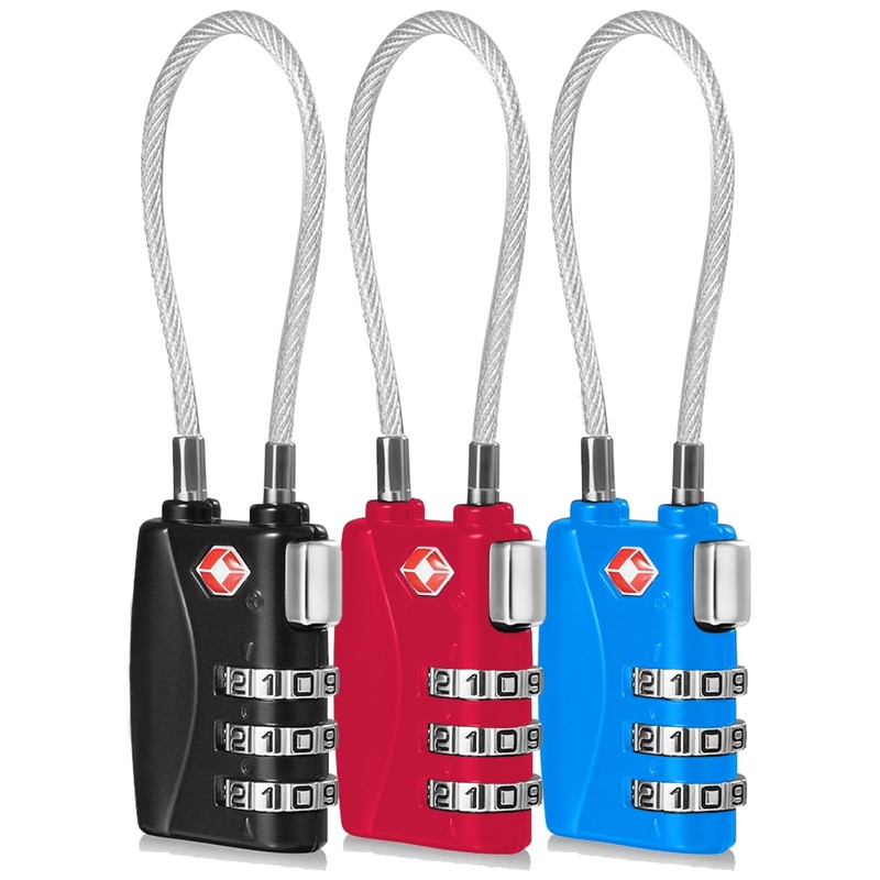 3x CFMOUR 3-Dial TSA Travel Cable Combination Padlock - Black&Blue&Red