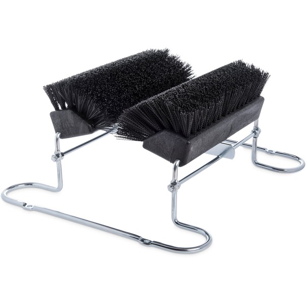 The Carlisle 4042403 Spectrum Boot 'N Shoe brush with chrome plated steel frame has angled brushes that help remove bacteria, refuse, dirt, and other contaminants from boots and shoes before entering sensitive sites, such as food processing areas. A steel scraper below the brush assists in the removal of heavy debris. The block is made of nonabsorbent plastic, and the bristles are black and made of polypropylene for durability and extended life. The frame is made of chrome steel tubing and can mount to the floor (mounting hardware sold separately) for secure placement.