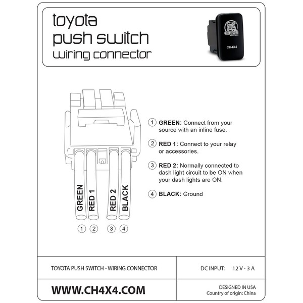 CH4x4 Industries Introduces our New High Quality 12 Volt Toyota Push Switch. This switch allows you to operate any 12 volt accessories, this fits on all late model Toyotas SUV’s and some other model cars, with short circuit protection, the CH4x4 Industries New High Quality 12 volt Push Switch will give you a clean and original style look, they are install in the existing holes that come with the vehicle, and it has a face surface size of 1.54? x 0.83? (39 mm x 21 mm). This switches are made out of heavy duty ABS plastic that will ensure years of service and come in a mate black surface color, the same color as the OEM Switches, All symbols are Laser etched directly onto the switch face using modern high Tech laser engraving equipment to ensure long image life. The switch is an electronic switch rated at 3 Amp’s. Therefore in ALL cases the accessory MUST be wired through a fused relay----FITS THESE VEHICLES: Toyota Tacoma 2005-2011 Toyota Tacoma 2012-2015 (Left Side ONLY) Toyota Tacoma 2016 (Left Side ONLY) Toyota FJ Cruiser 2007-2014 Toyota Fortuner 2005-2014 Toyota Hilux 2005-2014 Toyota Highlander 2001-2007 Toyota Tundra 2005-2006 (Center Console if equipped) Toyota 4Runner 2003-2009 Toyota Prado 120 Series 2003-2009 Toyota Land Cruiser 100 Series 1998-2007 Toyota Land Cruiser 75, 76, 78 & 79 series