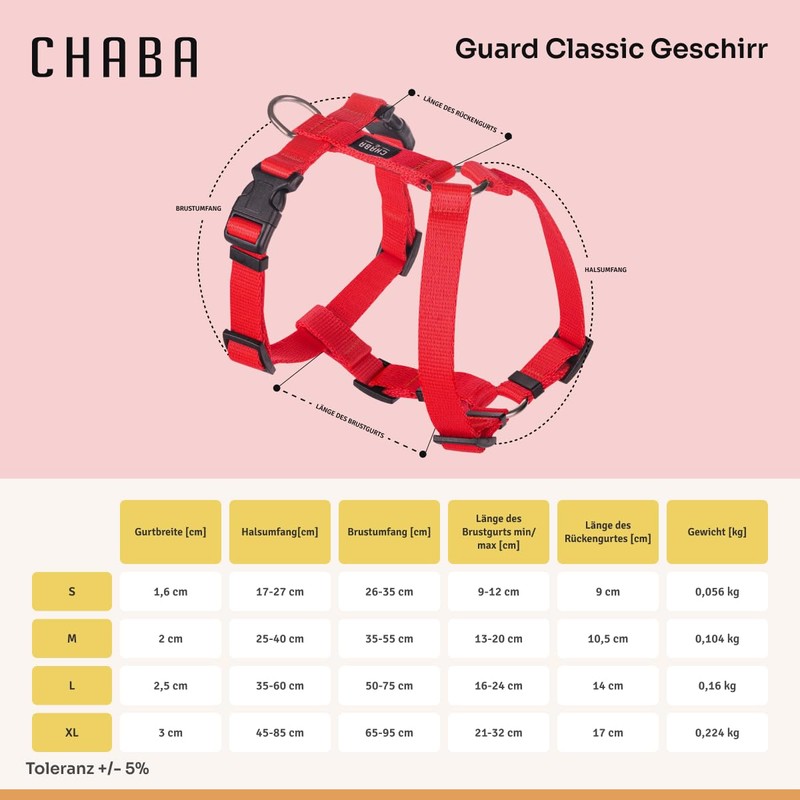 - 5-level adjustment: with the 5-way adjustability of the Chaba dog harness, you can give your dog full freedom of movement while walking while ensuring that it does not break out of the harness. Proper adjustment of the harness and size ensures maximum comfort for your pet.