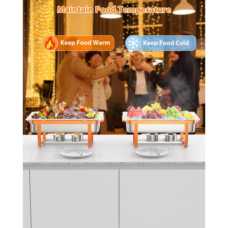 - 【Keep Food Warm or Cool】- The chafing dish buffet set for catering is designed to effectively keep food warm or cool, ensuring the optimal temperature for various dishes. When needs to warm food, add hot water and the fuel can, and when food needs to be cooled, add ice cubes, which allows for maintaining the desired temperature of the food throughout the event, delivering a delightful dining experience for guests