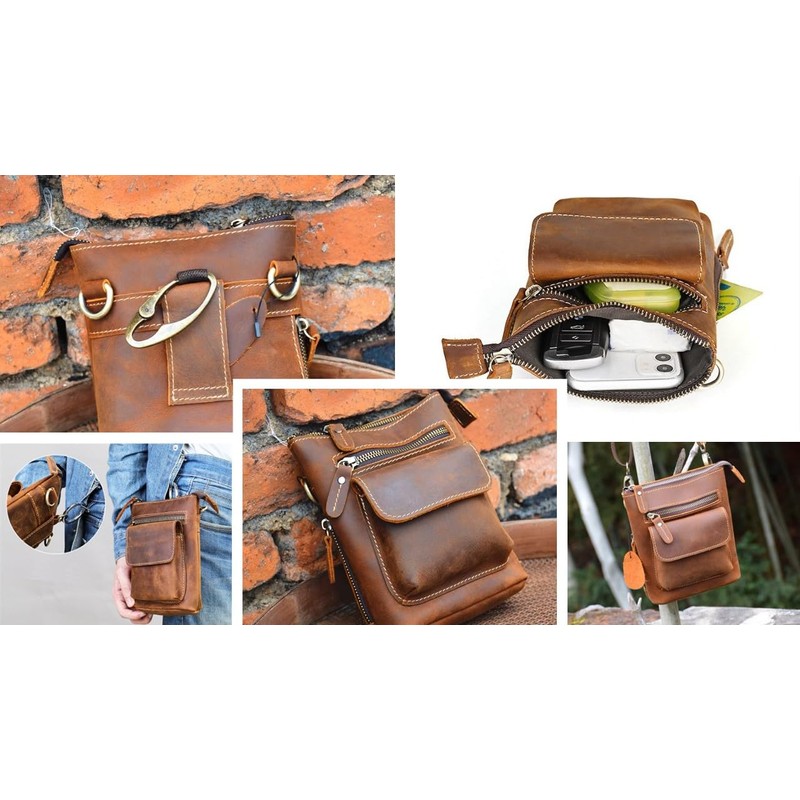 Chaiclo Casual Vintage Catavilla Belt Shoulder 3-Way Retro Genuine Leather Mini Leather Bag, Retro Style, Multi-functional 3-Way Small Leather Shoulder Pouch, Braun
