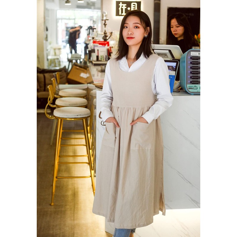 Women Apron Large Size Washed Cotton Linen with 2 Pockets Solid Color Japanese Kitchen Apron Kitchen Apron for Women
