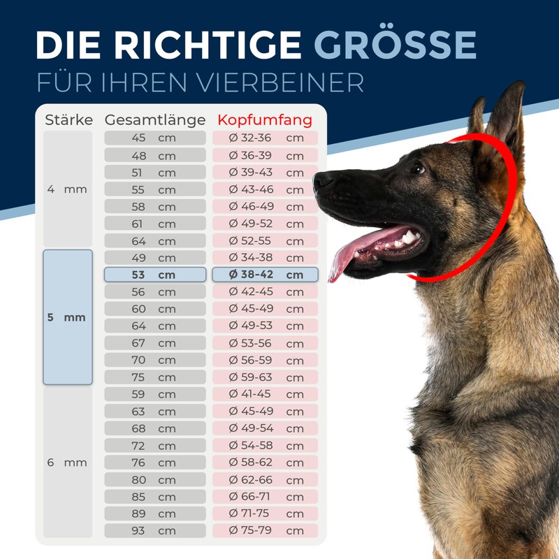 - Rust-proof chain collar with pull stop for dog training made of stainless steel - long link 5 mm thick - length 53 cm for a head circumference (measured at the thickest point) of 38-42 cm