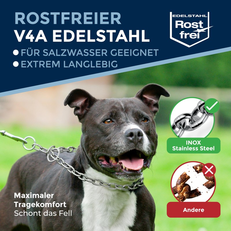 - The original with pull stop – now also on Amazon: the stainless dog chains from NietFullThings and niroxal. Our dog collar made of high-quality V4A stainless steel with additional passivation is rust-proof and protects your dog's coat. Collars without pull stop (pull limit) can be dangerous