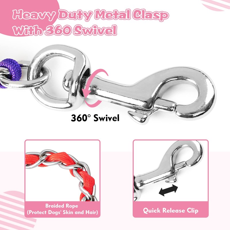 - 360 SWIVEL QUICK RELEASE CLASP: This chew proof dog chain is ended with a heavy duty metal clasp, it’s 360 Swivel and quick release featured, convenient to use and tangle free to offer your dogs more room of activity; With nylon rope woven into the chain, this leash can effectively protects dogs' hair and your hands from being clipped or scratched;