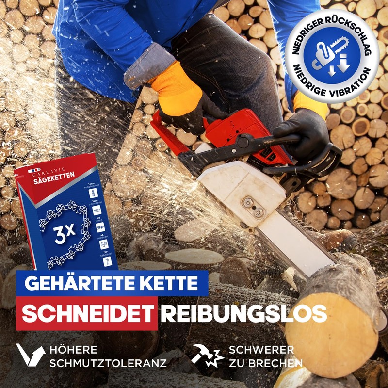 - Chain with minimal kickback – low vibration and durable, for easy care and handling. Shock absorber drive links and special depth limiter design ensure reduced kickback while maintaining consistent performance.
