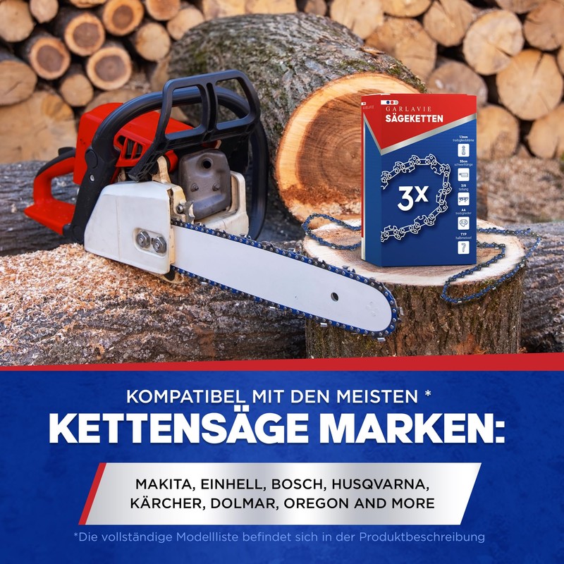 - Specifications: Set of 3 semi-chisel chainsaw chains, 3/8 inch pitch, 1.1 mm thickness of the drive link, suitable for 30 cm blade length and 44 drive links. Check your sword's settings before purchasing.