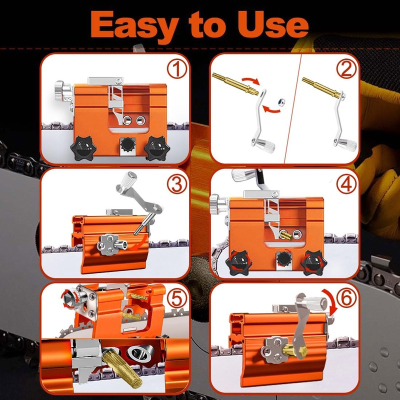 This chainsaw chain sharpener provides a simple and quick way to sharpen the chain. It just set the chainsaw sharpening jig to the chain saw, position the pawl over the teeth, insert the chainsaw sharpener bit into the guide sleeve.Then turn the handle,the dull chain clear again in just 2-5 Secs.It's a very quick way to sharpen your chainsaw without taking it all apart or changing the chain, well worth the money.