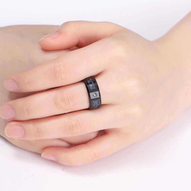 - Black-Plated tungsten ring with pure black polished inner surface, inlaid with blue and black carbon fiber & blue zircon, elegant and comfortable, deserves your favor.