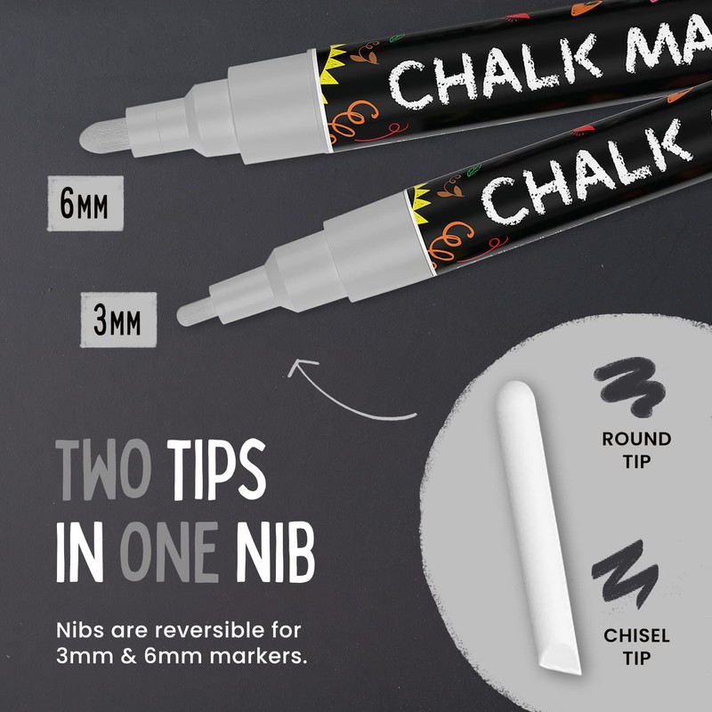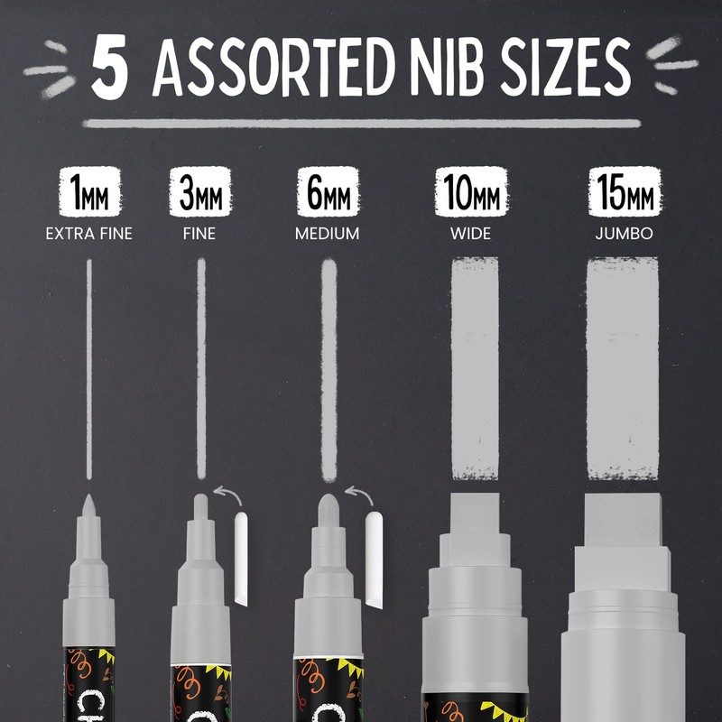 - Selection of tip sizes - extra fine 1 mm, fine 3 mm, 6 mm, 10 mm, and rectangular 15 mm tips. The 3 mm and 6 mm tips are reversible, round and chisel tip. The chalk marker set is perfect for wide, thick, and also fine lines.