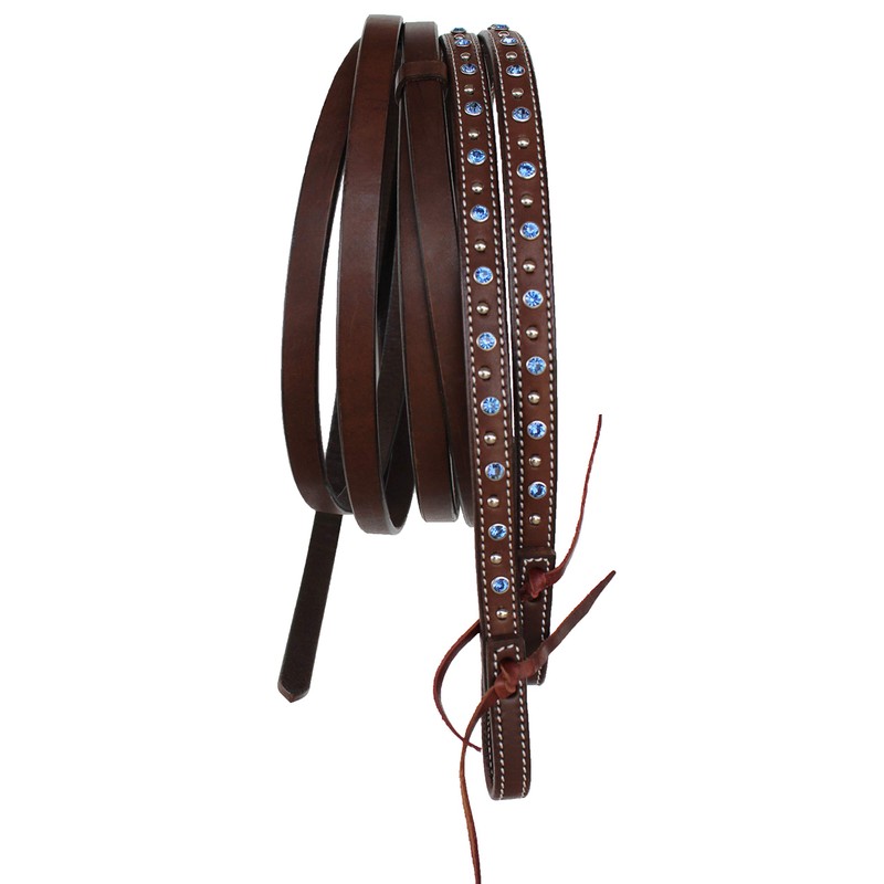 - Challenger western 5/8" x 7' leather split reins. The ends of the reins are accented beautifully with royal blue rhinestones and studs. Great for showing, or trail riding. Latigo tie bit ends.