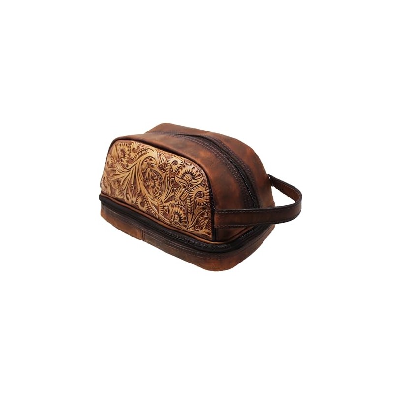 CHALLENGER Western Antique Floral Tooled Brown Leather Toiletry Dopp Kit Travel Bag 18SKT14