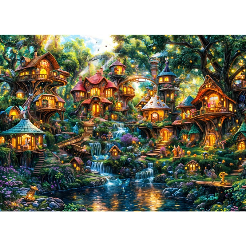 - START DIFFERENT LEVELS:The puzzle pattern depicts a dreamy forest with a slowly flowing river. Tree houses of various shapes are scattered throughout the forest. Elves are playing in the houses, while others are working hard to practice magic