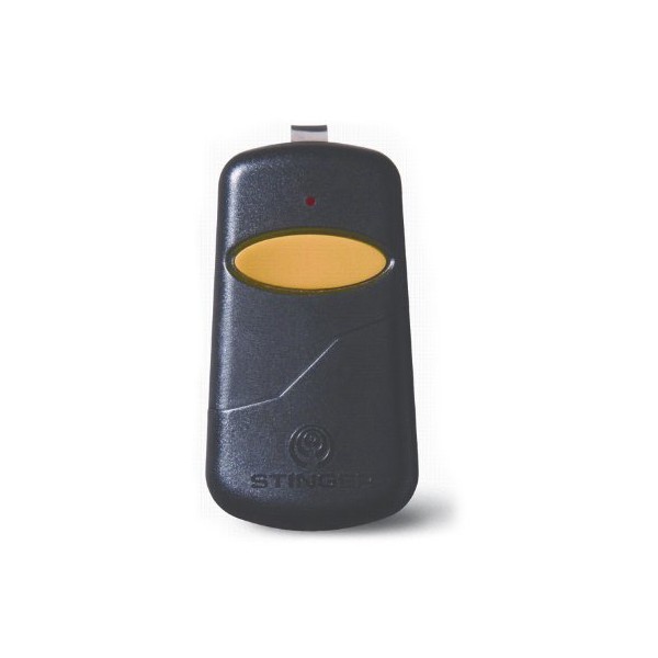 CONTENTS The Stinger transmitter is a very small (1-5/8" x 3" x 1/2") visor style remote operating at 390 MHz. The Stinger achieves its small size by using state-of-the-art, surface mount components. It has been designed for use with Chamberlain, LiftMaster and Sears receivers, with dip switches. PROGRAMMING Find the "learn" button on your existing garage door opener (the unit with the motor located on the ceiling of your garage). Press and hold this "learn" button for 2 seconds and the release. The LED light located beside the "learn" button will go on. Then press the button on your new transmitter remote for 1 second and then release to activate it. The LED light on your existing garage door opener will flash, then go off. Your remote transmitter is now programmed into your existing garage door opener and will operate your garage door. OPERATION Once the codes are set to match the transmitter codes, you may test the system. Ensure the gate or door is visible and clear before testing. Step 1- Push the Stinger's button from a distance of about ten feet. If the receiver activates, the switches are properly set. Step 2- Test the transmitter from several locations to discover any "blind spots" caused by interference. BATTERY ACCESS Slide front cover down to reach battery compartment. Be aware of battery polarity when replacing the A23 battery. TECHNICAL SPECIFICATIONS Operating Frequency- 390 MHz Number of Buttons- 1 Battery- 1 ea. 12V A23 Number Combinations- Lots :-) Operating Temperature- -20F - 100F Overall Dimensions- 1/2" x 3" x 1-5/8" Weight- 1 oz.
