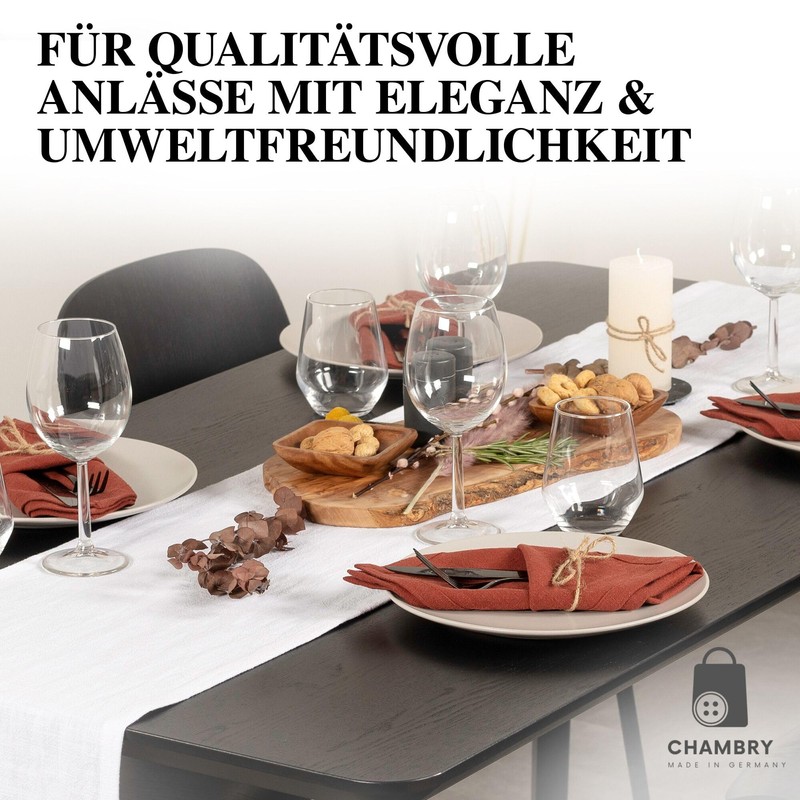 - 100% high-quality fabrics. At Chambry, we use high-quality and 100% sustainable linen. Our table runners are handmade, durable, non-toxic, environmentally friendly and convince in premium quality