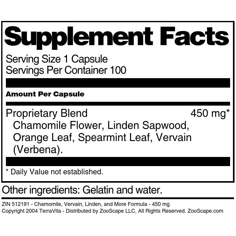 - Chamomile, Vervain, Linden, and More Formula - 450 mg (100 capsules, ZIN: 512191)