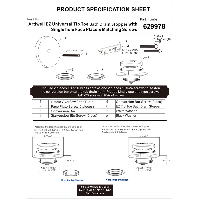 - EASY INSTALLATION: Artwell new design universal stopper and cover is more easier installation than the regular bath drain plug ,the installtions without removing the old drain , which is not the screwed style ,just need to slip into , you can ignore the screw specification, so install Artiwell Universal Tip toe bath drain stopper and Cover, you need’t professional plumber tools , plumber putty or call plumber provide the support , you can save some costs and time.