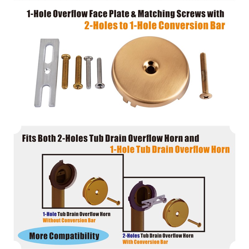 - COMPATIBILITY: Artiwell universal Champagne Bronze bathtub drain conversion kit have been tested by the plumber, the Bathtub drain stopper and cover can be replaced 99% lift and turn, Tip Toe and trip lever Bathtub drains, which includes 2 types of o-rings for you to choose from to fit your existing 1-3/8” or 1-1/2” tub drains. This single-Hole overflow faceplate with conversion bar and matching screws can fit Both one or two hole bathdrain and overflow horn.