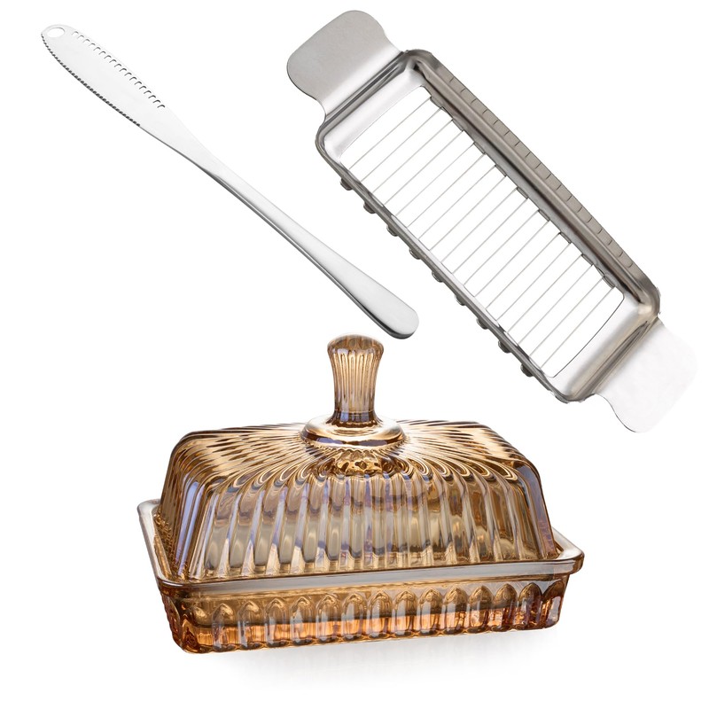 Champagne Crystal Glass Butter Dish with Lid - 6.7in Glass Container (Includes Butter Knife & Cutter)